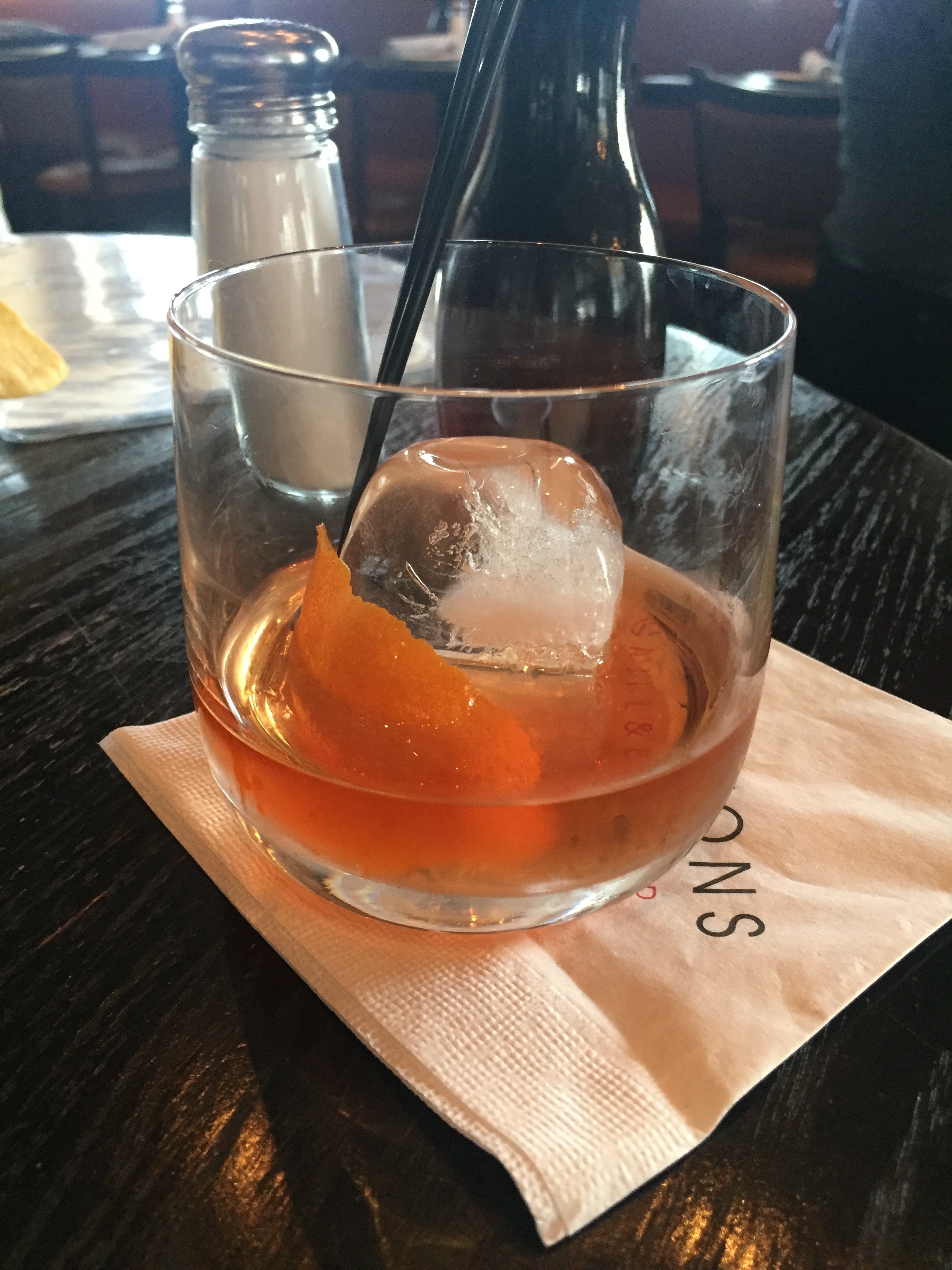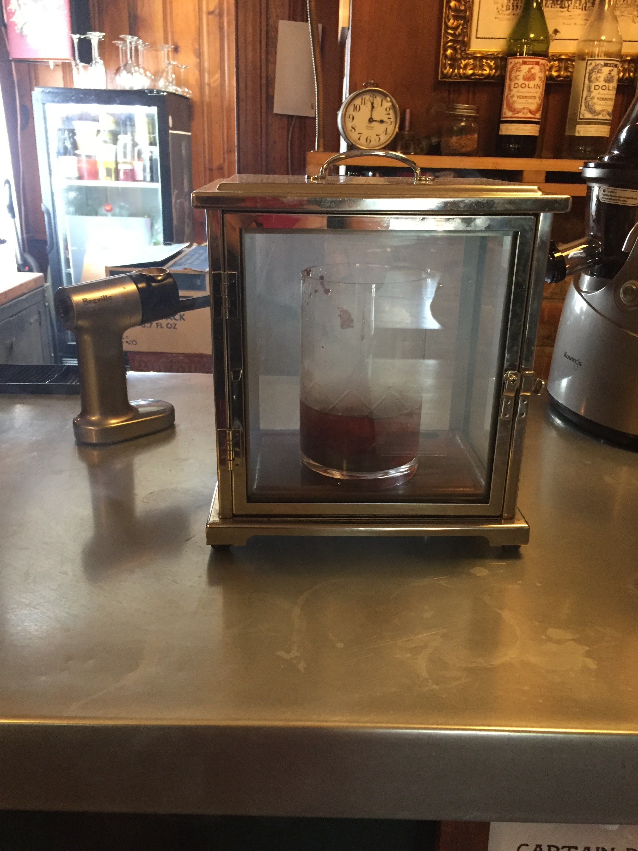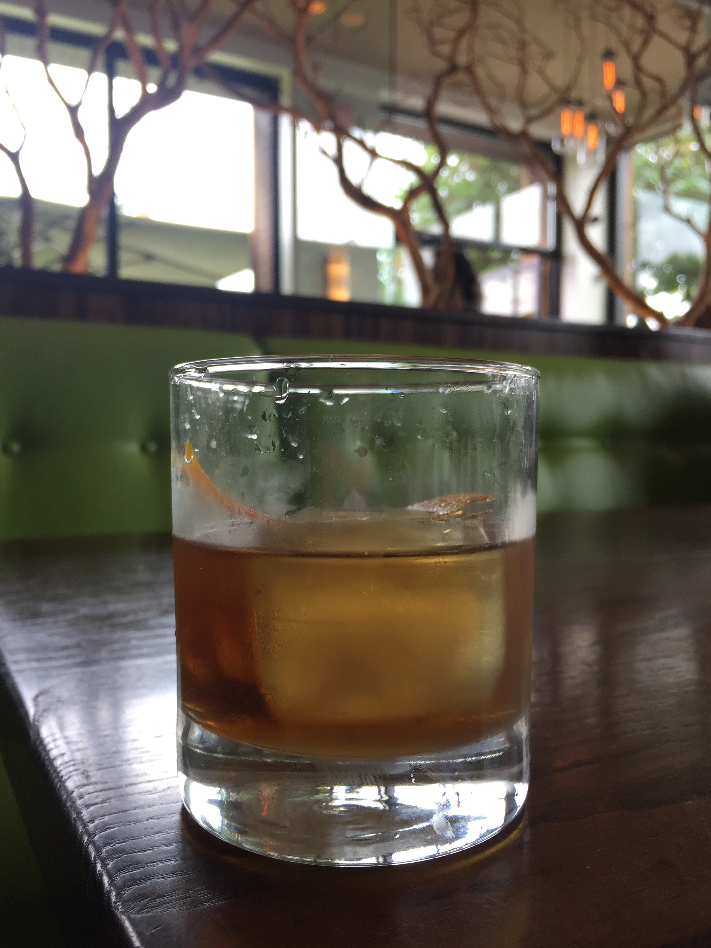 My rating: ***** out of 5! Delicious, with a lovely mouthfeel. Smooth and so easy to sip. Patrick, our bartender, added to the fun by showing us how the drink is made. Since Husband and I both ordered one, Patrick muddled and mixed in a beaker-type container, and then he placed it in a glass chamber and piped in applewood smoke. Oh yes, we watched that baby SMOKE! Patrick then removed the container (still slightly smoking), strained it into glasses with large ice cubes, and added orange twists. Happily, the drink was not overwhelmingly smoky, like some Scotches may be. The smoke flavor was discernable, as was a pleasant sweetness. Husband was also very impressed, and he is picky about his bourbon drinks.