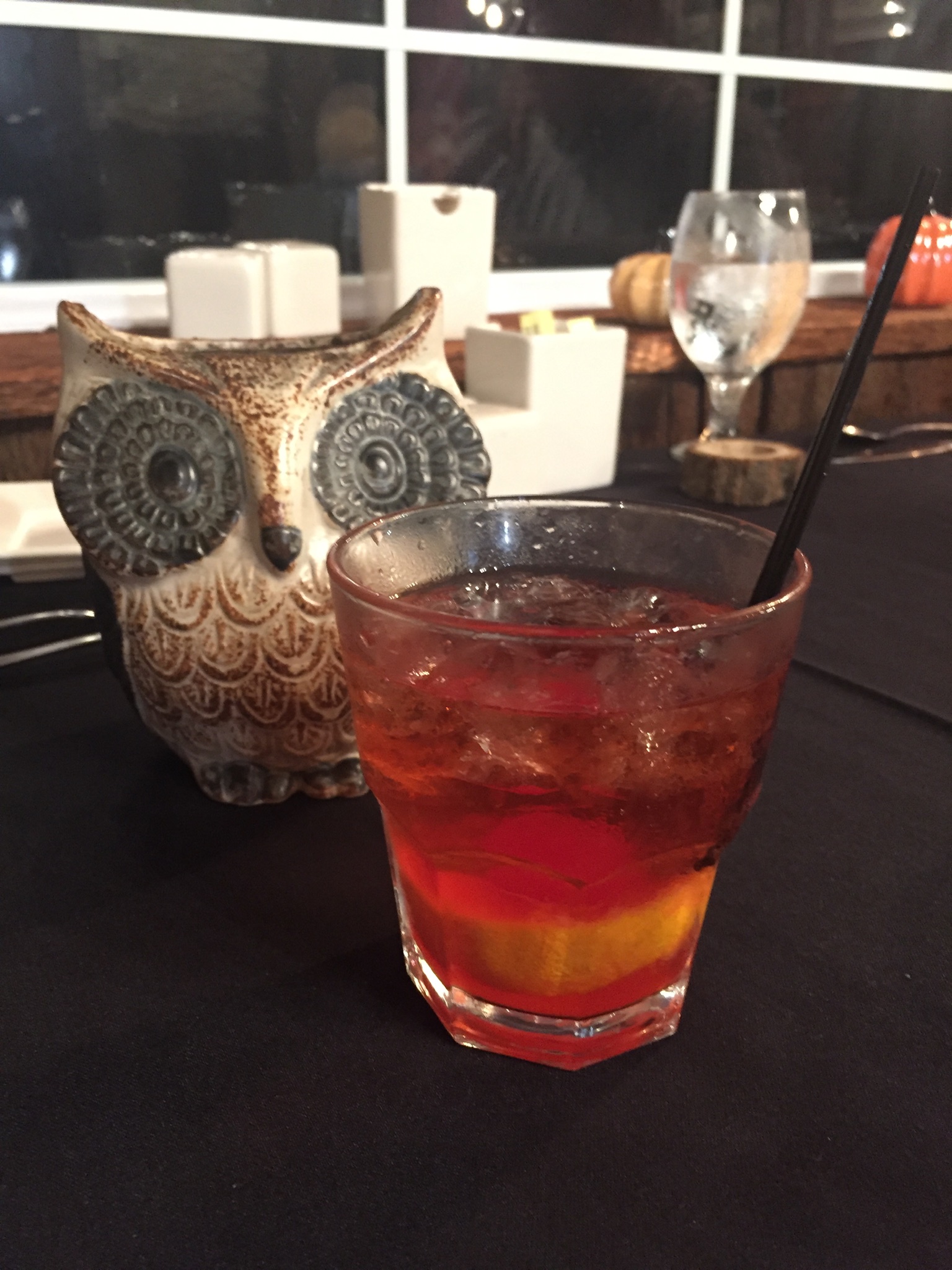 Ingredients: Seagram’s 7 blended whiskey, muddled quarter of an orange, whole maraschino cherry, sugar, bitters, soda. The orange flavor was prominent, the cherry flavor was not.