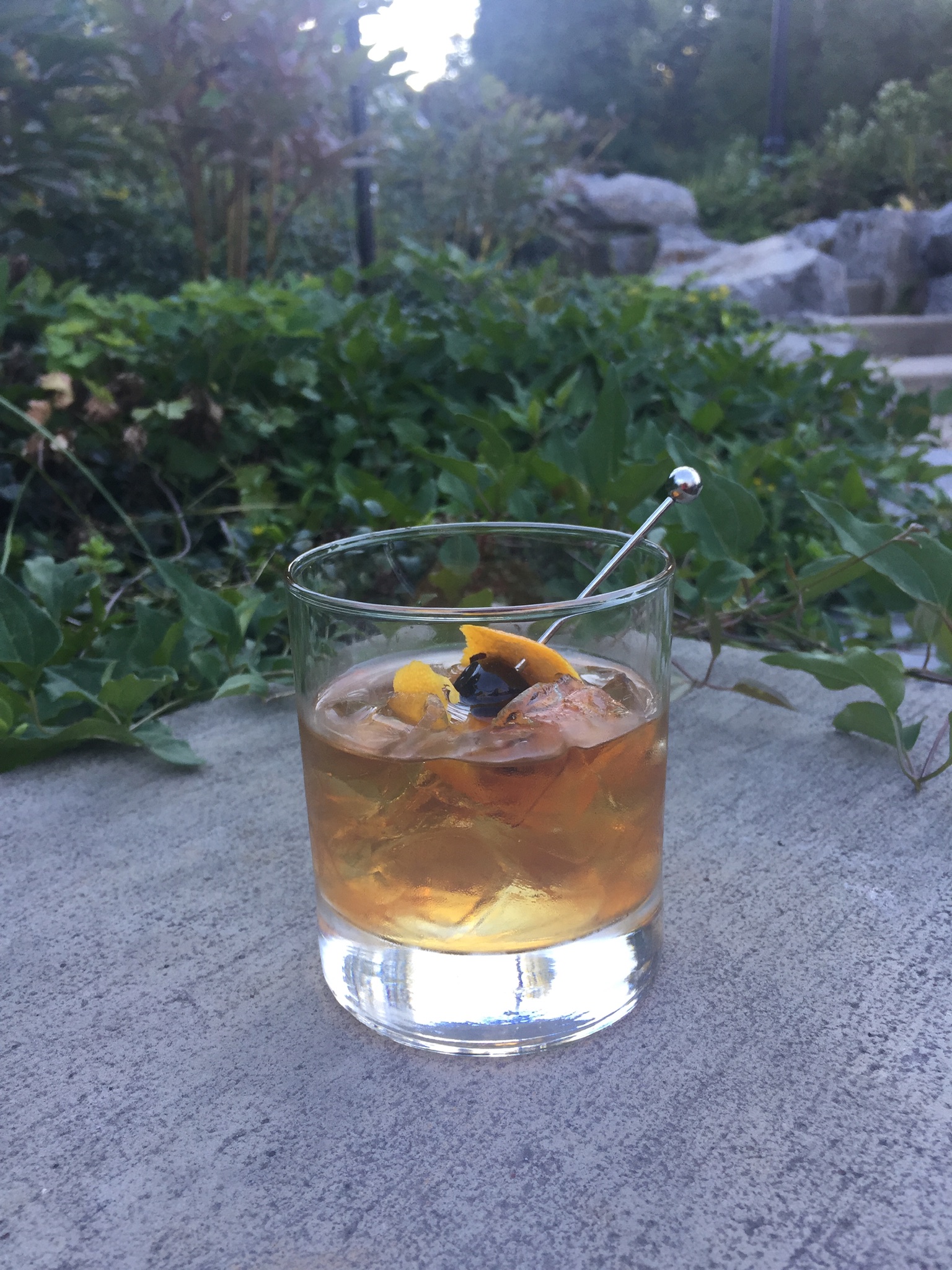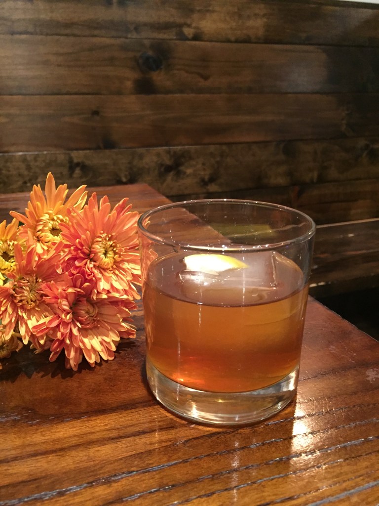 Ingredients: Iron Shoe single barrel whiskey, plum, plum bitters, orange ice cube.