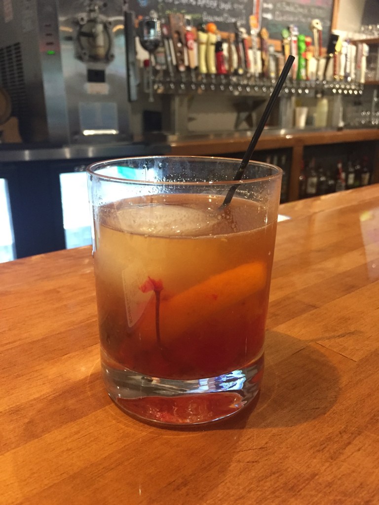 My rating: **** out of 5. I am assuming the “plum” ingredient was a plum syrup, and this added a raisin-like flavor to the drink, so making it sweeter than a typical Old Fashioned. Even though Michigan is renowned for its cherries, there was not a single cherry to be found (gasp!) in this version of the drink. I remember picking plums once, in an orchard in Michigan, so I suspect the plums used were a local product.
