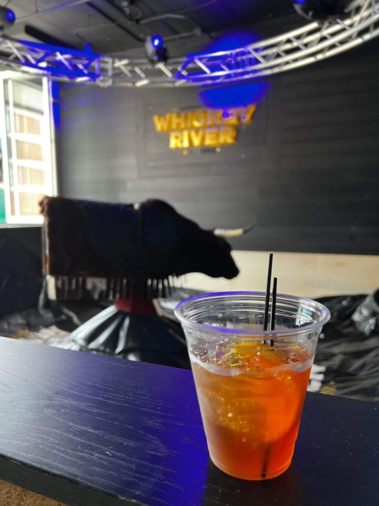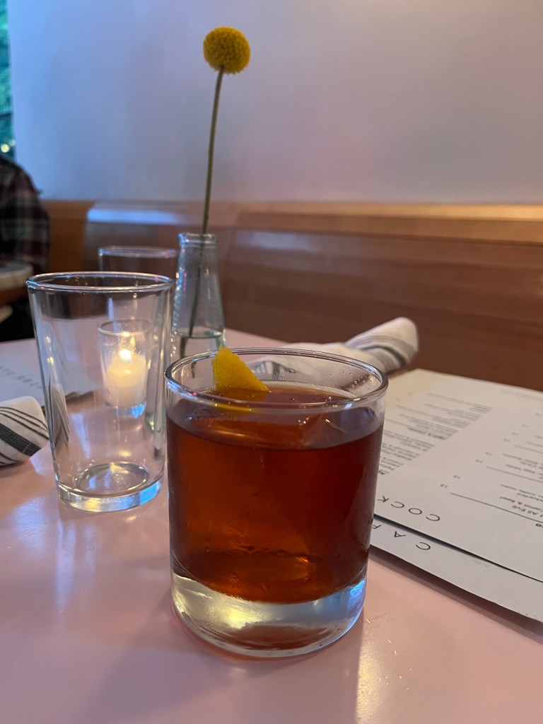 Ingredients: 1 large ice cube, 2 oz makers mark, 0.5 oz fig juice, 2 dashes of angostura bitters, garnished with fig and cracked black pepper.