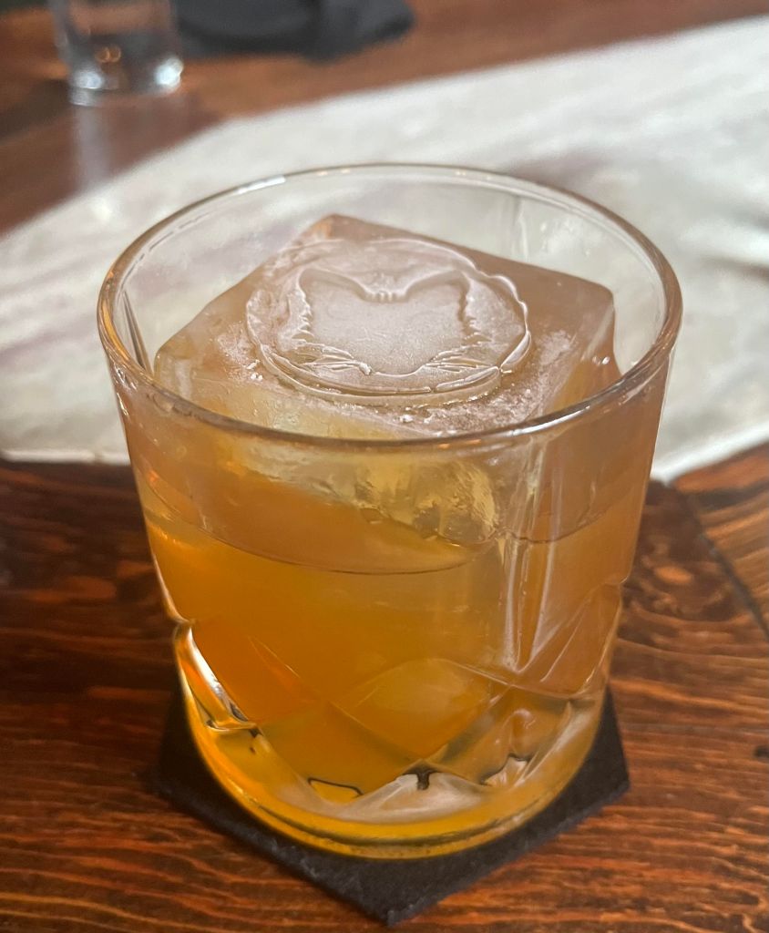 My rating: **** out of 5. The cocktail menu here lists not only ingredients, but also graphics showing how “spiritous” and “adventurous” each drink is. My goal is to find delicious and/or unique versions of the Old Fashioned, so I chose the “Twice Baked” since it was ranked the most “adventurous” of the four (!!!) Old Fashioneds available. The drink was strong and flavorful, and artfully blended, but the lemon oil smell and flavor reminded me a bit of furniture polish, and made the drink a tad too bitter. The ice cube, imprinted with a fox head, made me chuckle.