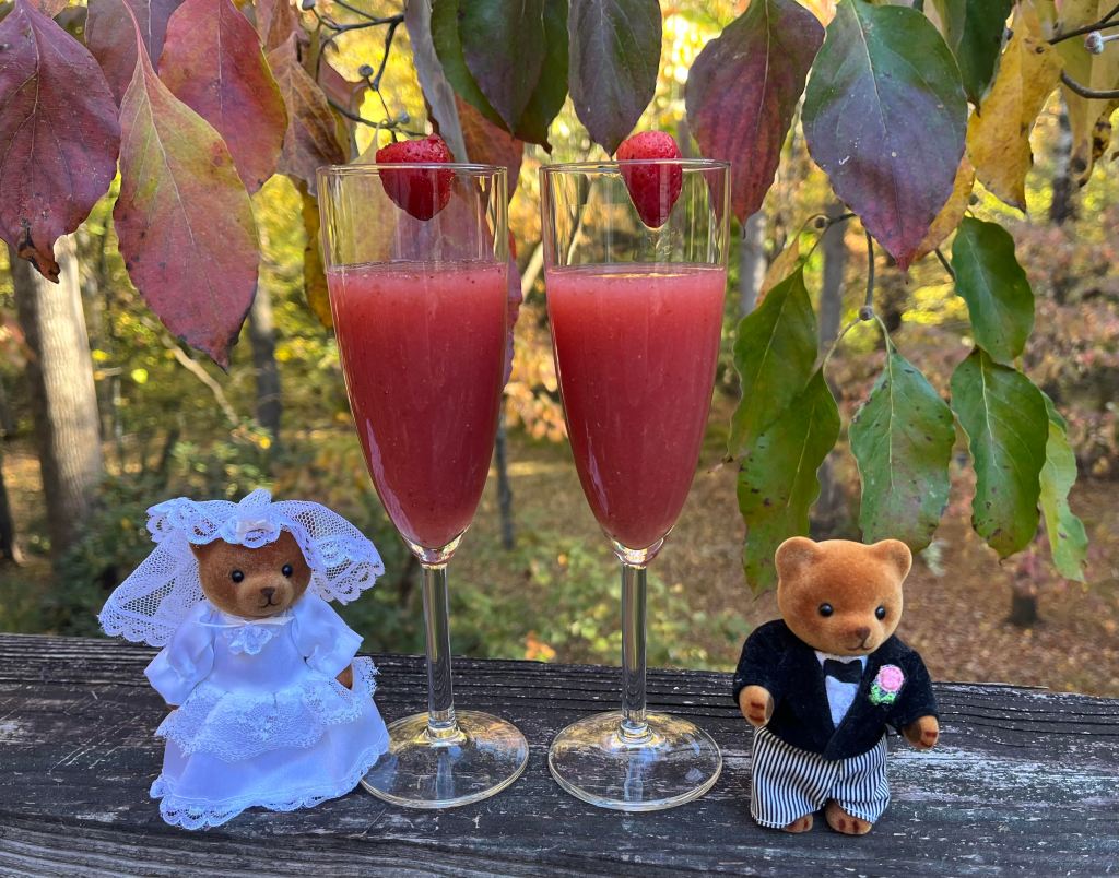 Today is our 35th wedding anniversary. We celebrated last night with these drinks, and then today with an elegant (and delicious) brunch at The Farmhouse at Veritas, one of our favorite wineries, in the beautiful mountains of Nelson County, Virginia. I lost track of how many flutes of sparkling wine I drank, and happily, Dear Husband knows my weakness and agreed to be Designated Driver. The sun was shining and the fall colors were glorious! We made wonderful memories to add to our ever-growing list.