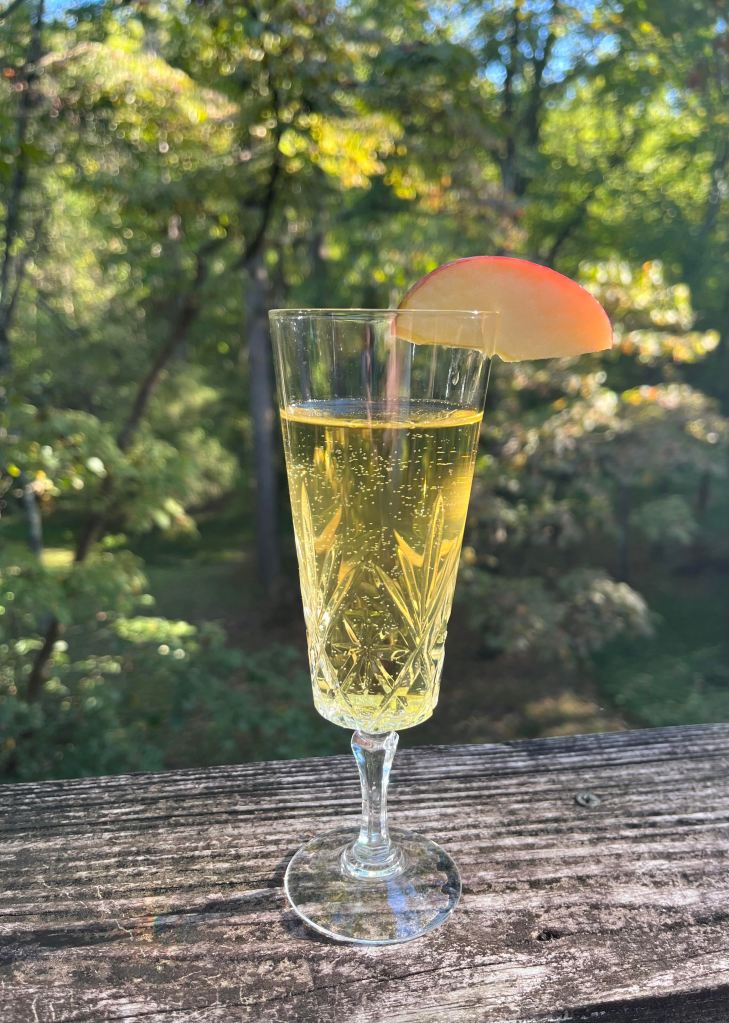 Pour 1 ounce Żubrówka (Polish bison grass vodka) into a fluted glass. Add 2 ounces sparkling apple juice, and perhaps a pinch of cinnamon. This drink is commonly known as a Szarlotka, which is also the name of a delightful Polish apple tart.