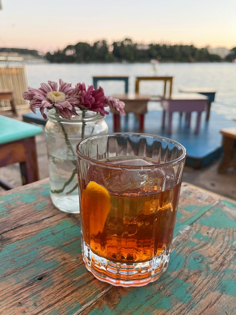 The occasion: This was our first evening in Croatia! We left Venice in the morning, spent the afternoon in lush Motovun, on the gorgeous Istrian Peninsula. For the next two days, our plans were to further explore Istria, and especially the seaside town of Rovinj. Our inn was only a few blocks away from this waterside bar, and we so enjoyed sitting on a bench and watching the sun set over the Adriatic Sea.